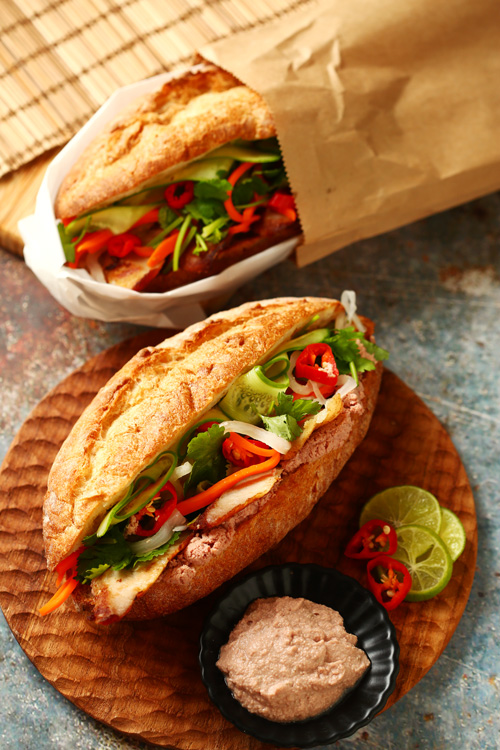 在越南料理中,法包(bánh mì)是一種短小法國麵包,通常沿長邊切開,內夾肉類和其他地道食材。這食譜用簡單無添加的做法,外皮酥脆,內裡濕潤鬆軟。學會使用日本入口的雞肝自製香濃滑順的雞肝醬,搭配西班牙豬頸肉,烤至焦香多汁。此外,還將會學習自製越南法包不能缺少的酸甜蘿蔔泡菜,讓每一口都展現了天然食材的真實風味。
